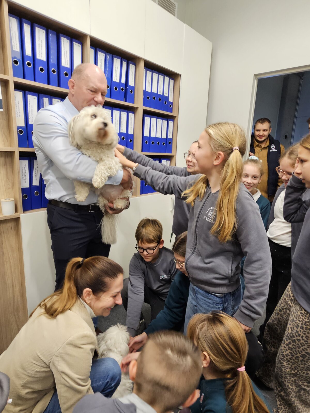 Mokiniai susipažino su mini automobilių ir keturračių pardavimo įmone, susitiko su jos vadovu Dariumi Andriulaičiu, apžiūrėjo direktoriaus kabinetą ir pasisveikino su nuolatiniais įmonės „darbuotojais“ – augintiniais.