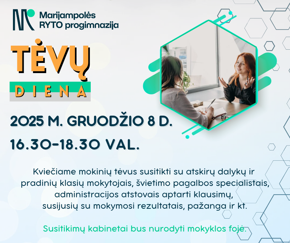 Kviečiame į TĖVŲ DIENĄ, kuri vyks gruodžio 8 d. 16.30-18.30 val. Turėsite galimybę susitikti ir pabendrauti su mokytojais, specialistais, administracijos atstovais.