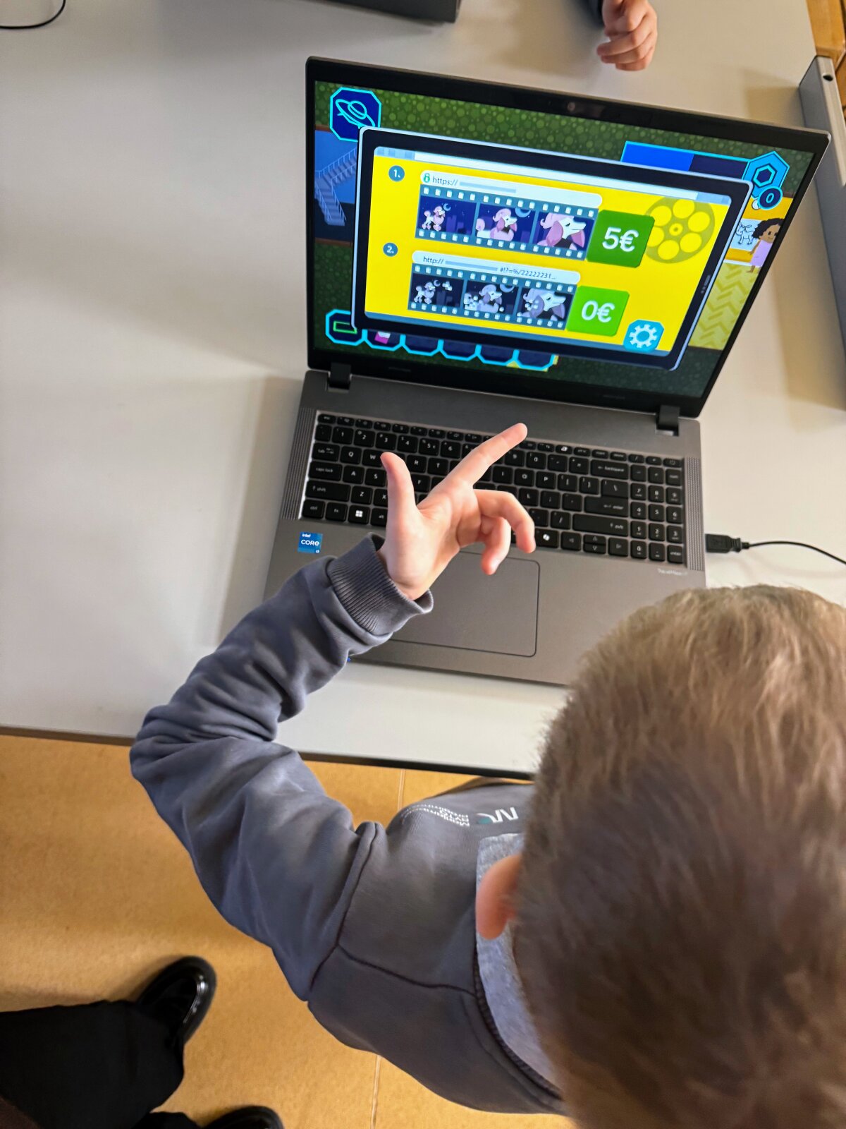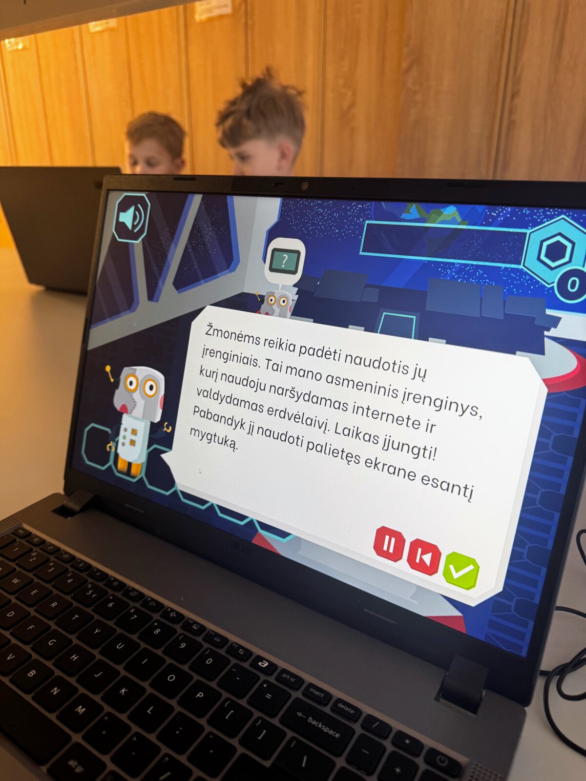 Mokiniai kartu su mokytoja dar kartą aptarė, ką anksčiau buvo išmokę apie saugų ir draugišką internetą – kaip bendrauti pagarbiai, saugoti asmens duomenis ir atsakingai naudotis išmaniaisiais įrenginiais. Turėdami šias žinias, jie žaidė edukacinį kibernetinio saugumo žaidimą, kuriame praktiškai įtvirtino supratimą apie interneto pavojus, saugų bendravimą ir poreikį kreiptis pagalbos į suaugusįjį sudėtingose situacijose. Be to, naudodami programėlę mokiniai kūrė savo skaitmeninius ,,avatarus“, taip mokydamiesi, kaip galima saugiai pristatyti save internete be tikrų nuotraukų. Visa veikla padėjo vaikams suvokti, kaip kūrybiškai, bet atsakingai naudoti technologijas ir apsaugoti savo tapatybę skaitmeninėje erdvėje.
