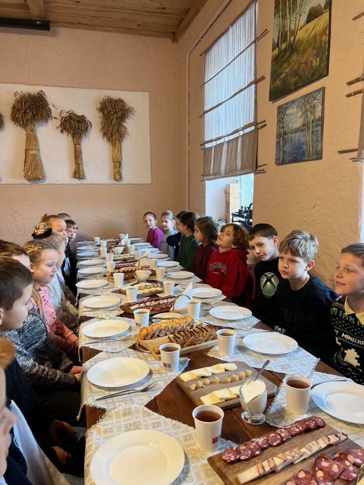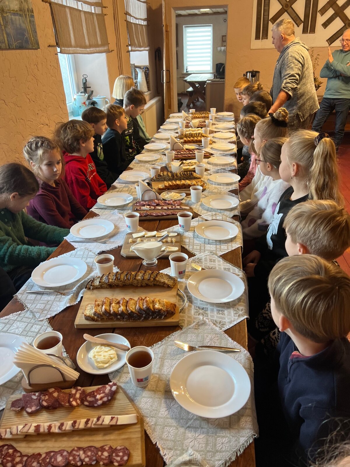 Po darbų visi buvo pakviesti prie svetingai paruošto stalo. Jame puikavosi ne tik garuojantis kugelis, bet ir skilandis, lašinukai, sūris, medus, obuolių pyragas – tikros tradicinės vaišės, kurios vaikams paliko didelį įspūdį.