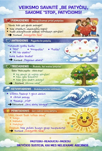 Mokiniai per savaitę dalysis savo mintimis, mokysis atpažinti patyčias, tinkamai reaguoti ir kurti draugiškesnę aplinką. Ateik – dalyvauk – būk pokytis!