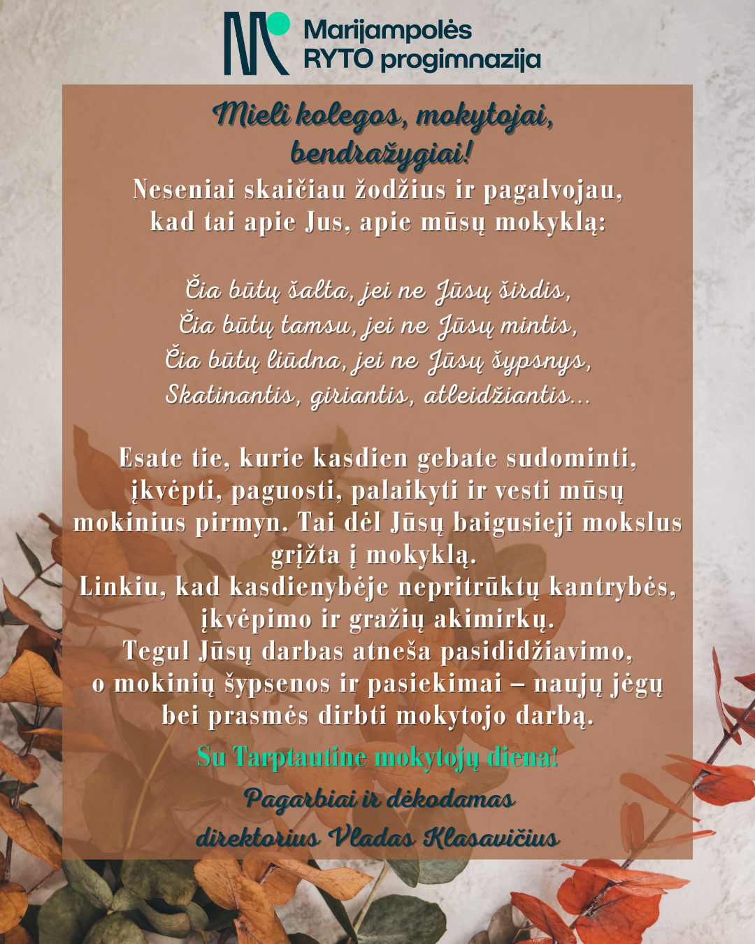 Linkiu, kad kasdienybėje nepritrūktų kantrybės, įkvėpimo ir gražių akimirkų. Tegul Jūsų darbas atneša pasididžiavimo, o mokinių šypsenos ir pasiekimai – naujų jėgų bei prasmės dirbti mokytojo darbą.
