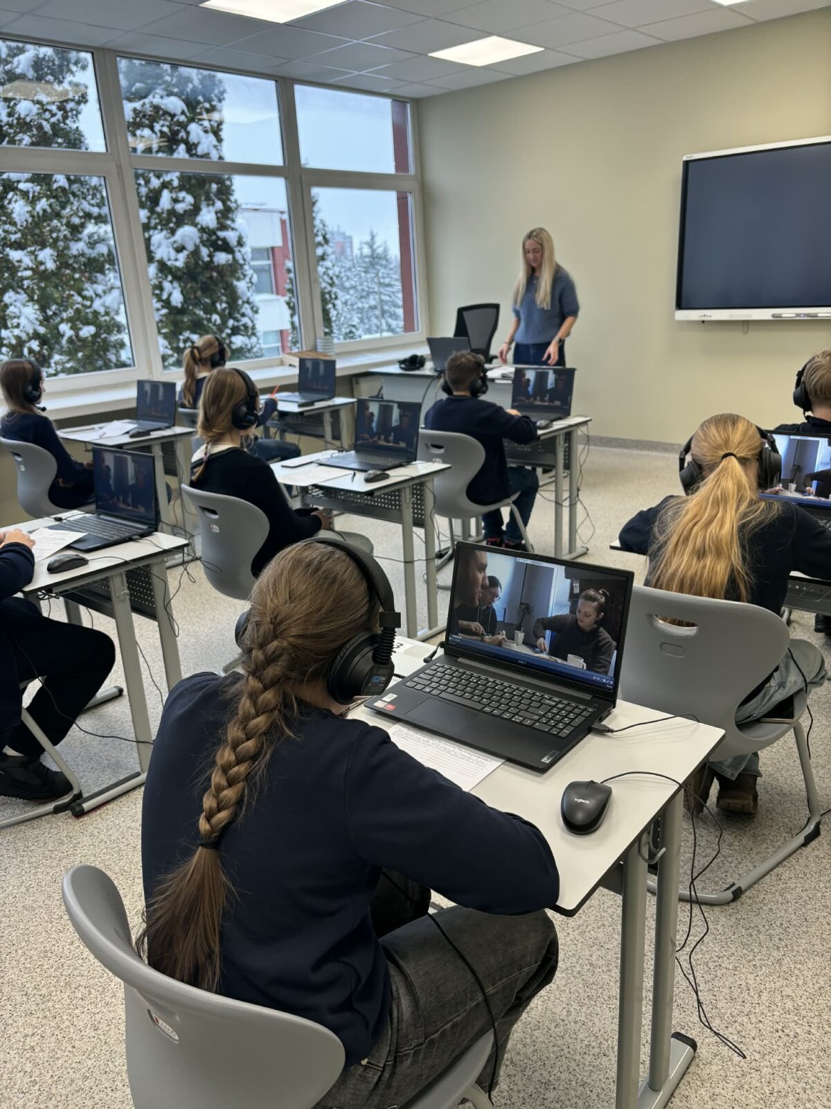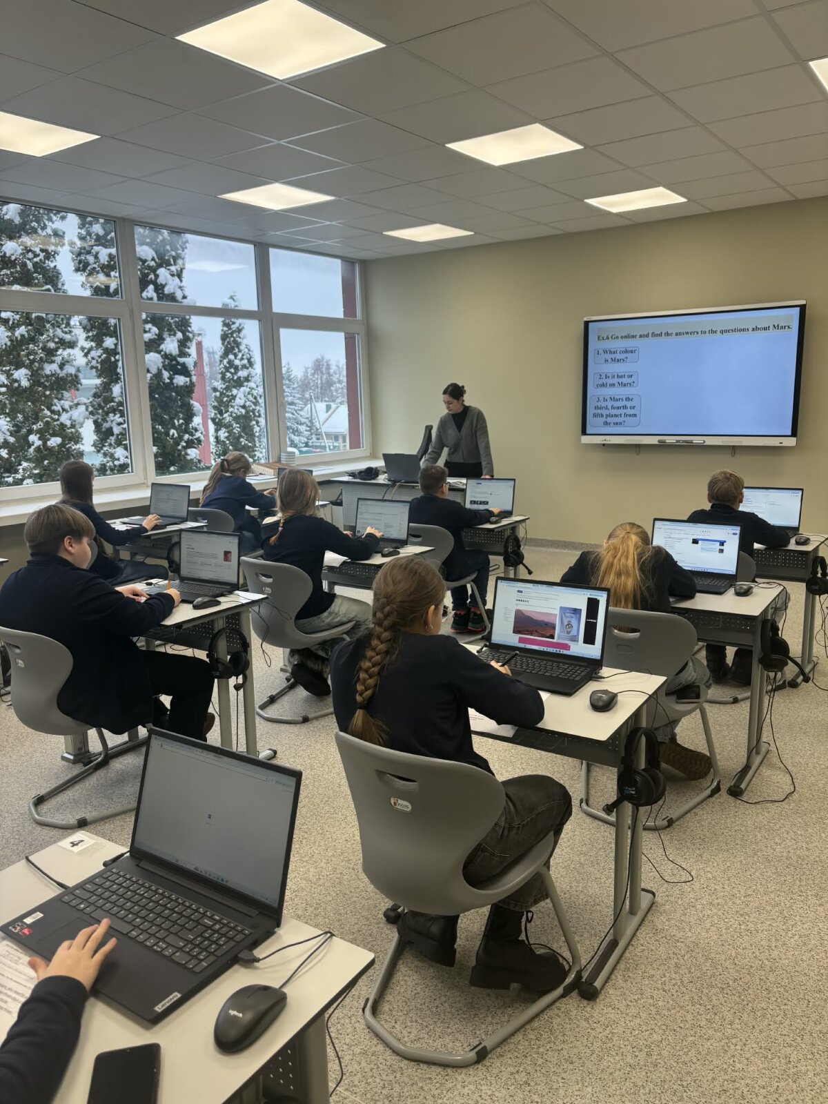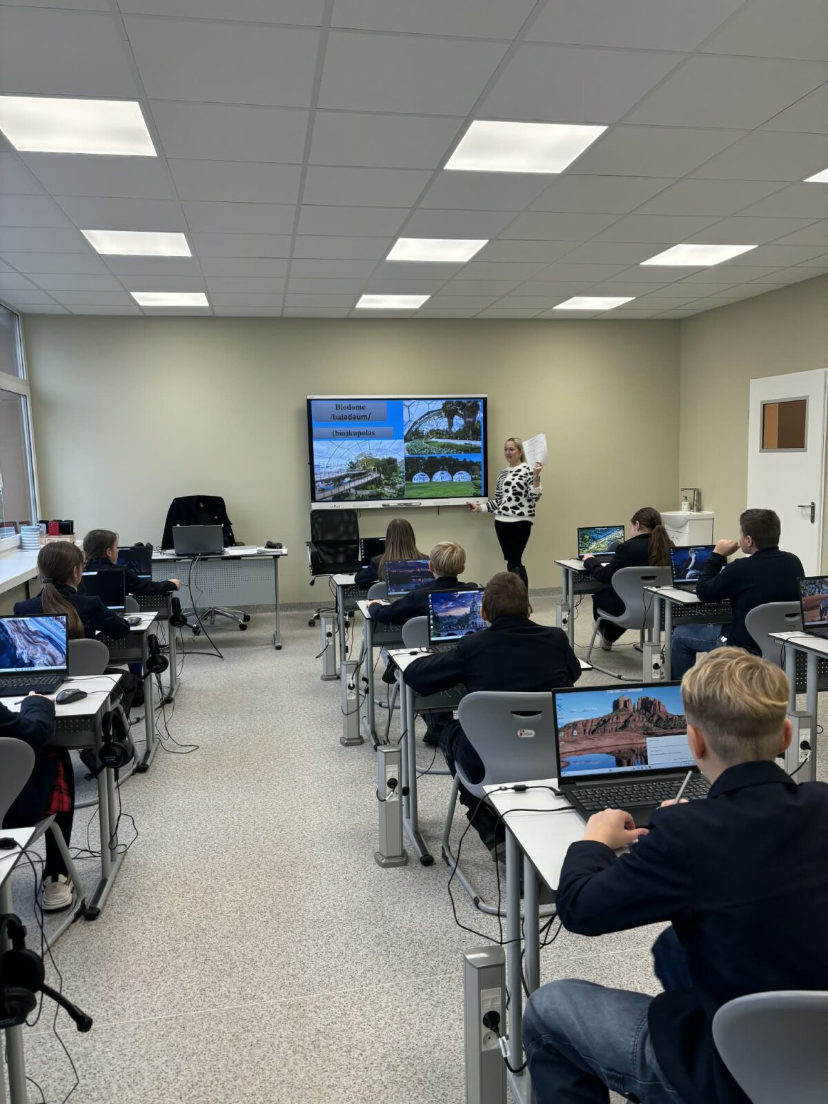 Vėliau mokiniai tęsė veiklas Kalbų laboratorijoje. Čia jie atliko interaktyvias užduotis, aiškinosi biokupolų sąvoką, jų paskirtį ir mokėsi naujų anglų kalbos žodžių, susijusių su nagrinėjama tema.